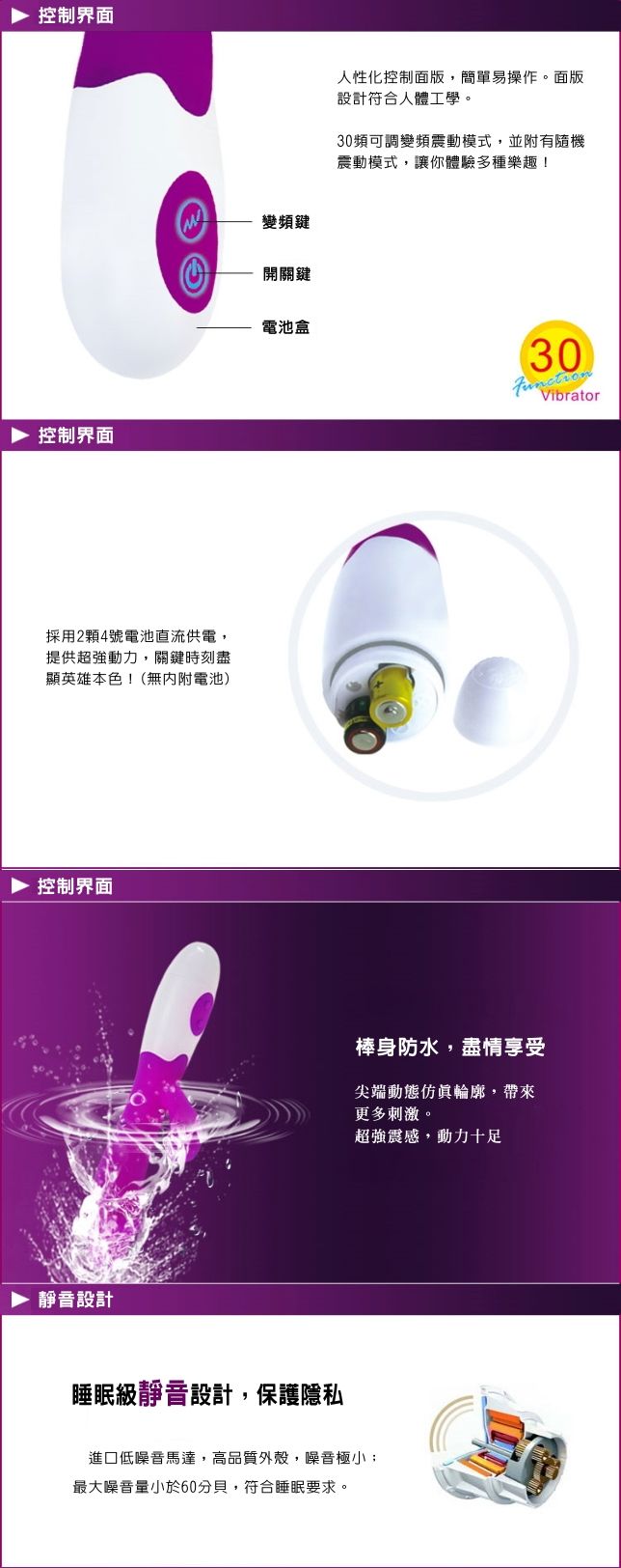 人性化控制面版,簡單易操作。30頻可調變頻震動模式,並附有隨機震動模式,讓你體驗各種樂趣!防水及靜音設計讓你使用更安心更愉悅!