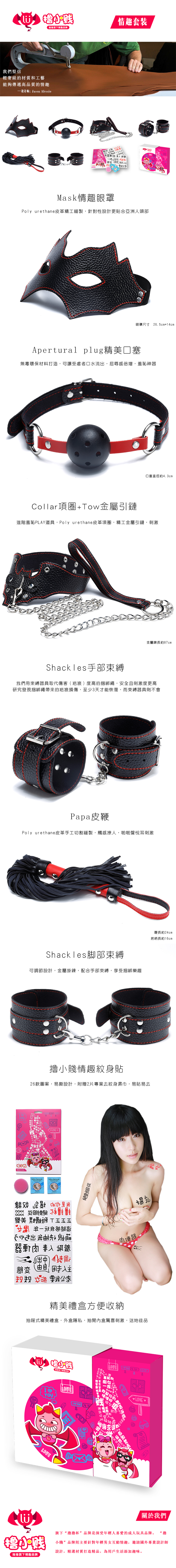 內容物:眼罩、口枷、皮鞭、首枷、手銬、腳銬、奴鍊、紋身貼紙各1,共8件